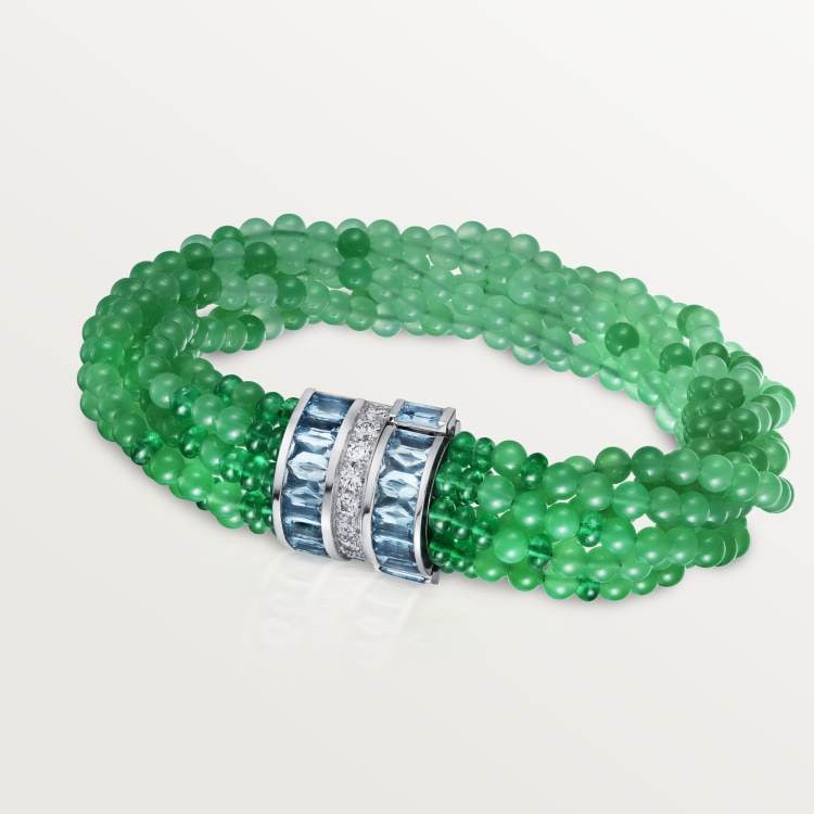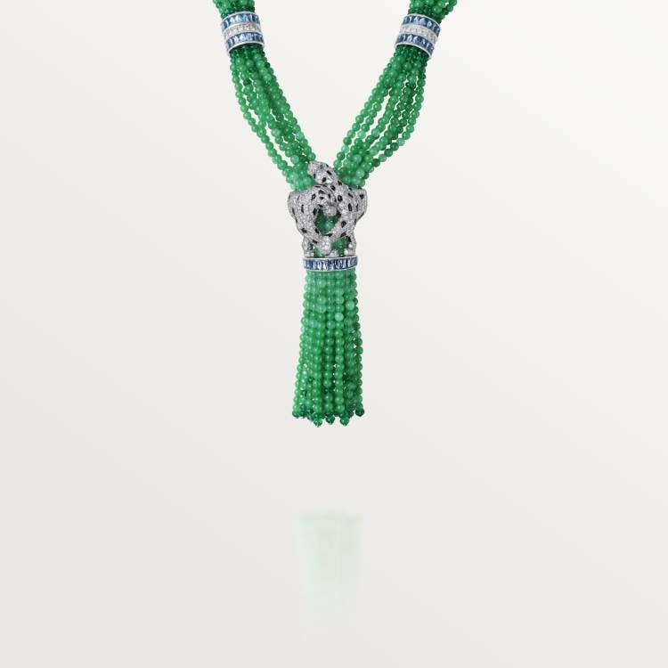 PANTHÈRE DE CARTIER necklace, 750‰ white gold, set with 175 emeralds, 42 onyx leopard spots, 2 onyx leopard noses, 83 aquamarines, 1,610 chrysoprase, 456 round brilliants totaling 8.70 carats cut diamond.